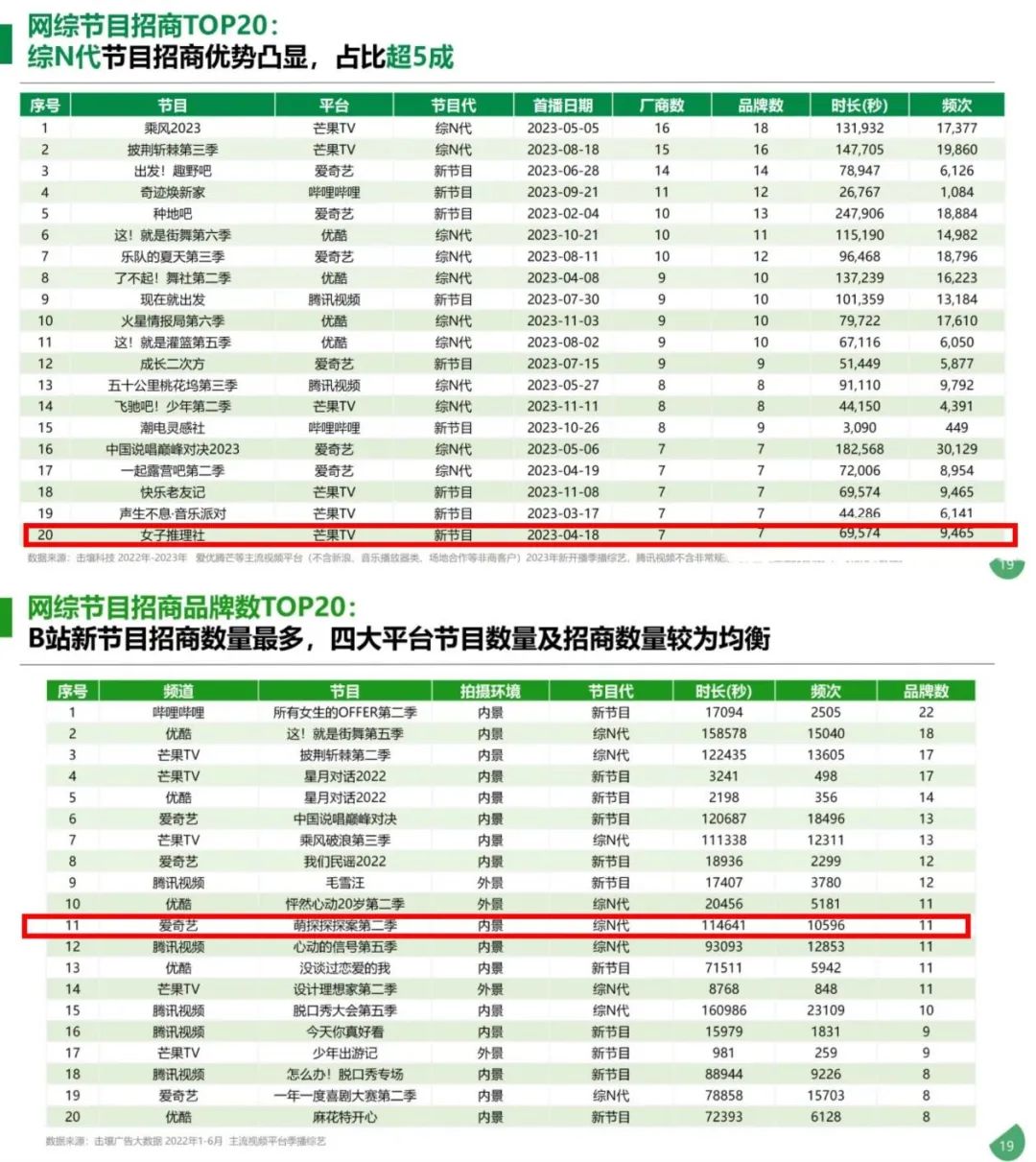 据击壤数据报告显示,在2022网综招商综节目招商TOP20中,仅有爱奇艺《萌探探探案2》一档节目上榜。无独有偶,2023年也只有一档踩着TOP20上榜的芒果TV《女子推理社》,并且该节目没有独家冠名商。