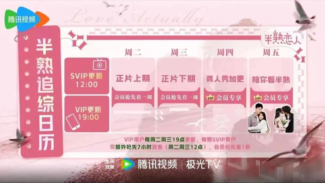 诚如《半熟恋人》第一季在“裸播到底”之下迎来了不俗的会员拉新与市场话题,第二季便正式拿着冠名与赞助向平台用户免费供应,而到了今年的第三季,又丢失了冠名的《半熟恋人3》直接被装扮成了会员综艺,且打出了SVIP提前七小时抢先看的字样。