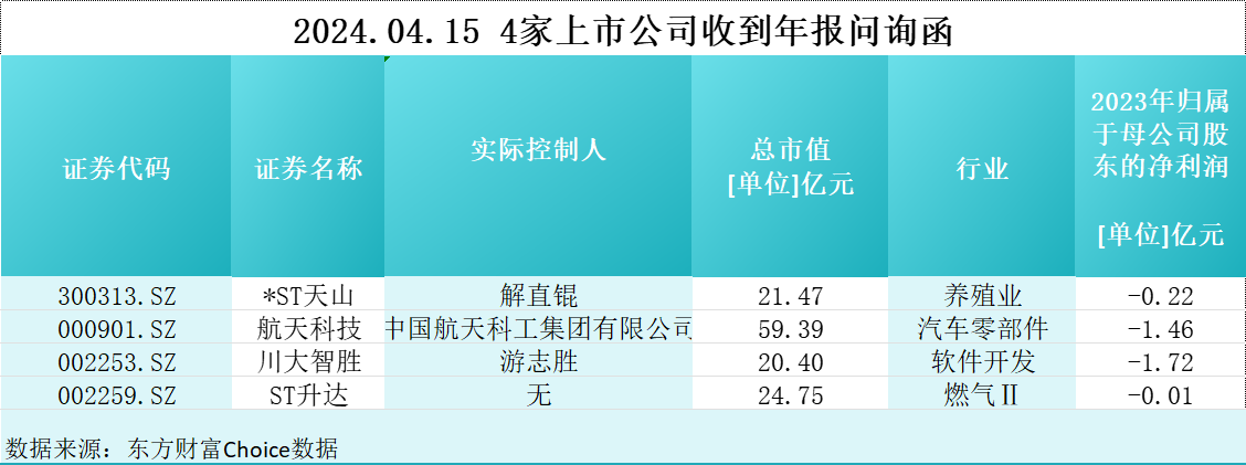 4月15日,A股*ST天山(300313.SZ)、ST升达(002259.SZ)、航天科技(000901.SZ)、川大智胜(002253.SZ)4家上市公司收到2023年年报问询函,截至2023年末这4家上市公司股东户数合计达14.3万户。