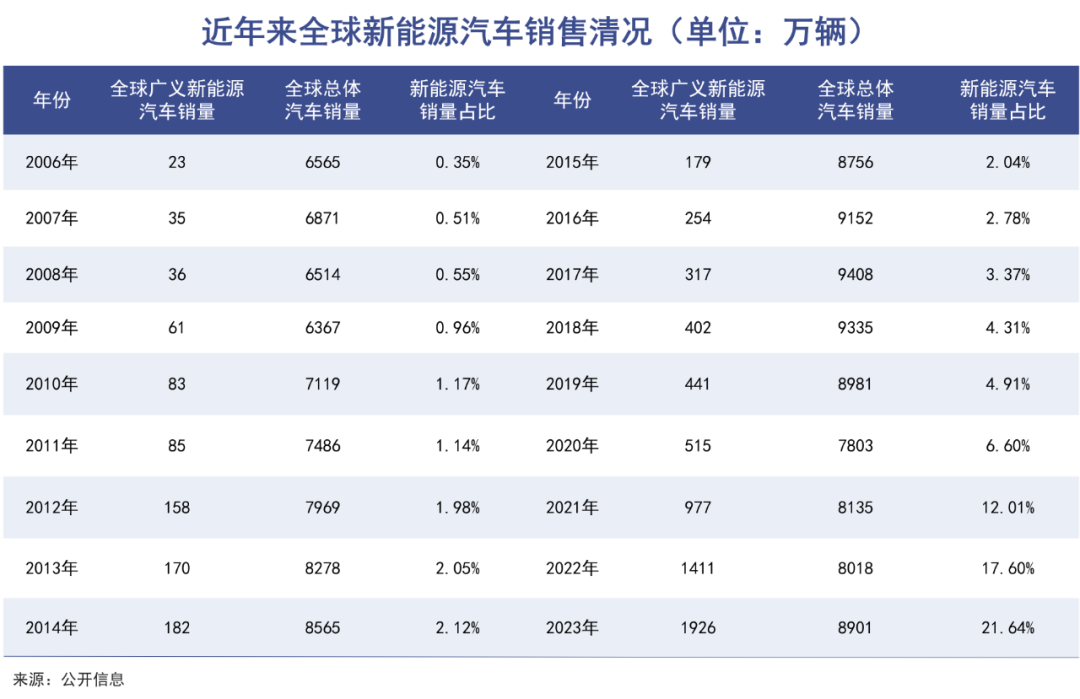 2023年,新能源车汽车销量1926万台,渗透率达到了21.64%。燃油车渗透率比2022年又明显下降了4个百分点。更为关键的是,2023年全球汽车销售总量为8901万台,已经较2017年降低了5.4%。
