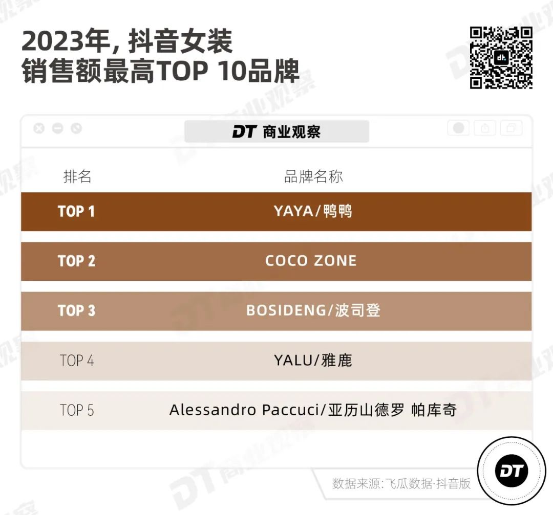 抖音2023年女装销售额最高的TOP 3品牌,王一博代言的羽绒服品牌鸭鸭排第一,波司登第三,夹在中间的第二名正是COCO ZONE。