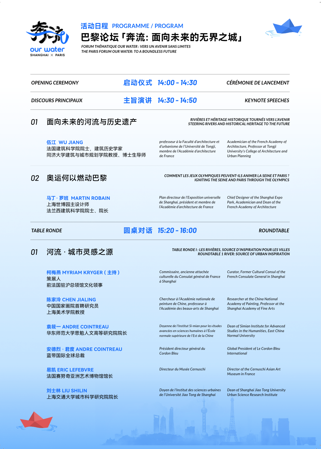 巴黎论坛以“奔流:面向未来的无界之城”为主题,分主旨演讲和圆桌对话两部分。在主旨演讲环节,法国建筑科学院院士、同济大学建筑与城市规划学院教授伍江将分享上海“一江一河”的历史遗产、发展脉络和远景规划。上海世博园主设计师马丁·罗班(Martin Robain)则将聚焦塞纳河近年来的创新治理,分享巴黎奥运之际塞纳河重焕活力的实践。