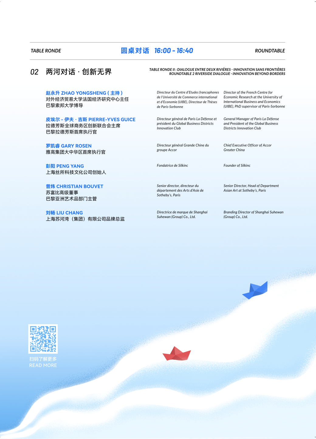 圆桌讨论环节分为人文艺术场和企业商贸场。海派艺术家陈家泠、法国赛努奇亚洲艺术博物馆馆长易凯 (Eric Lefebvre)、蓝带国际全球总裁安德烈·君度( Andre Cointreau)、雅高集团大中华区首席执行官(Gary Rosen)等中外各界嘉宾将参与讨论。