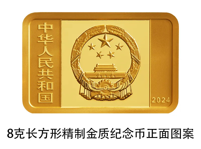 8克长方形金质纪念币为精制币,含纯金8克,规格23毫米×15毫米,面额100元,成色99.9%,最大发行量10000枚。