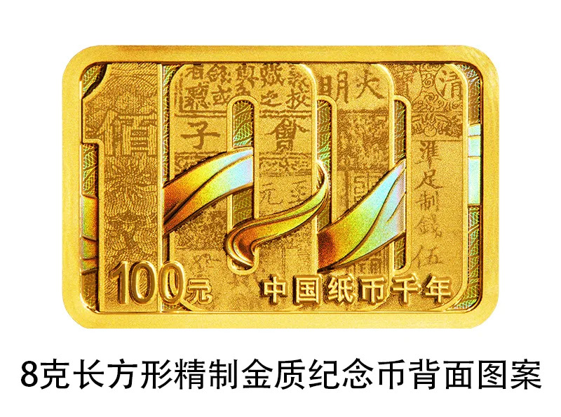 8克长方形金质纪念币背面图案为数字“1000”、具有代表性的纸币元素及飘带等组合设计,并刊“中国纸币千年”字样及面额。