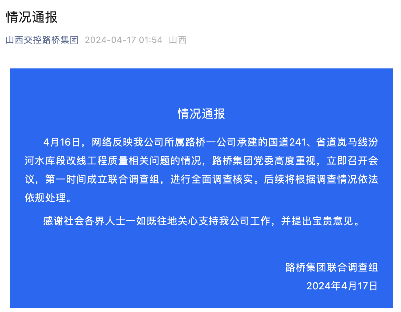 山西路桥集团联合调查组4月17日发布情况通报称,4月16日,网络反映我公司所属路桥一公司承建的国道241、省道岚马线汾河水库段改线工程质量相关问题的情况,路桥集团党委高度重视,立即召开会议,第一时间成立联合调查组,进行全面调查核实。后续将根据调查情况依法依规处理。