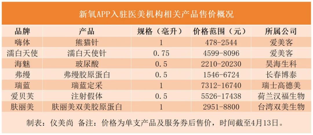 那么,上述价格现象,是否为薇旖美极纯III型胶原蛋白这个产品独有?为此,仪美尚梳理了新氧平台上不同品牌医美产品的价格。
