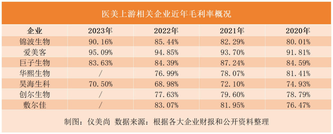 反观以锦波生物、爱美客等为代表的医美上游企业,由于掌握了技术壁垒,在价格上具有话语权,暂时有着更强的盈利能力。2020年—2023年,锦波生物的毛利率从80.01%增长至90.16%,直逼爱美客。