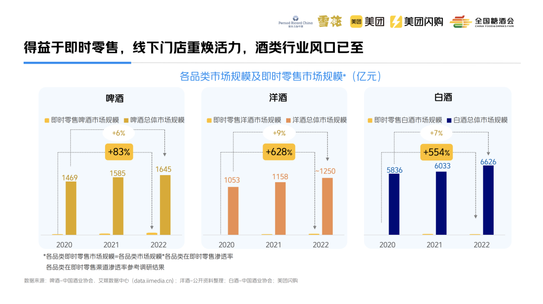 在急速扩大的即时零售领域,酒类表现出了强劲的增长态势。根据美团闪购此前发布的《2023即时零售酒类白皮书》,2020年至2022年,在即时零售市场规模中,啤酒增长83%、洋酒增长628%、白酒增长554%,远高于酒水品类大盘增长。
