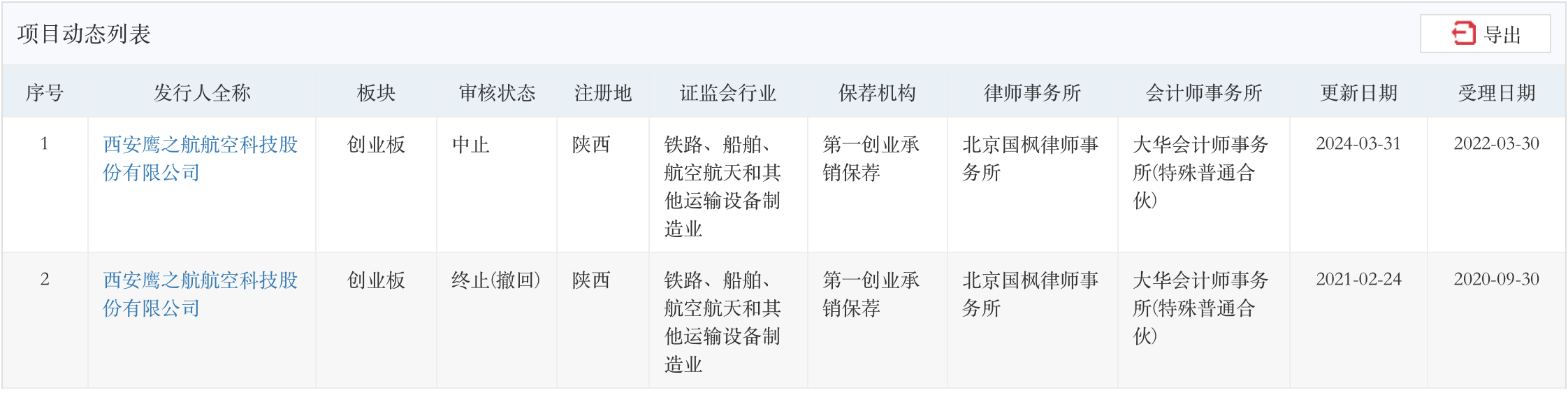 另如西安鹰之航航空科技股份有限公司(下称鹰之航),其曾在2020年9月30日获得创业板受理,2020年10月31日进入问询环节,2021年2月份公司抽中现场检查后,很快就撤回首发申请。一晃1年过去,鹰之航再度发起冲锋,仍然是创业板,仍然是第一创业承销保荐,以及一样的北京国枫律师事务所和大华会计师师事务所(特殊普通合伙),值得注意的是,其在2022年4月份再一次“幸运”抽中现场检查。这一次鹰之航没有选择撤回,而是坚持到现在,目前该公司因“财务资料已过有效期,需要补充提交”而状态为“中止”。