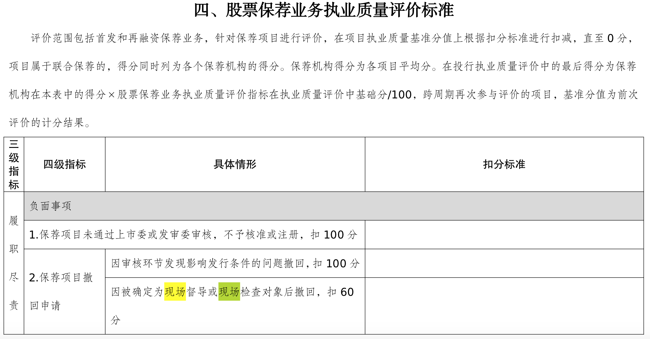 根据2024年1月份中国证券业协会发布的《证券公司投行业务质量评价办法》,其中就提到“因被确定为现场督导或现场检查对象后撤回”,证券公司是要扣分的,另外“现场检查或督导配合度差”也同样是扣分项。