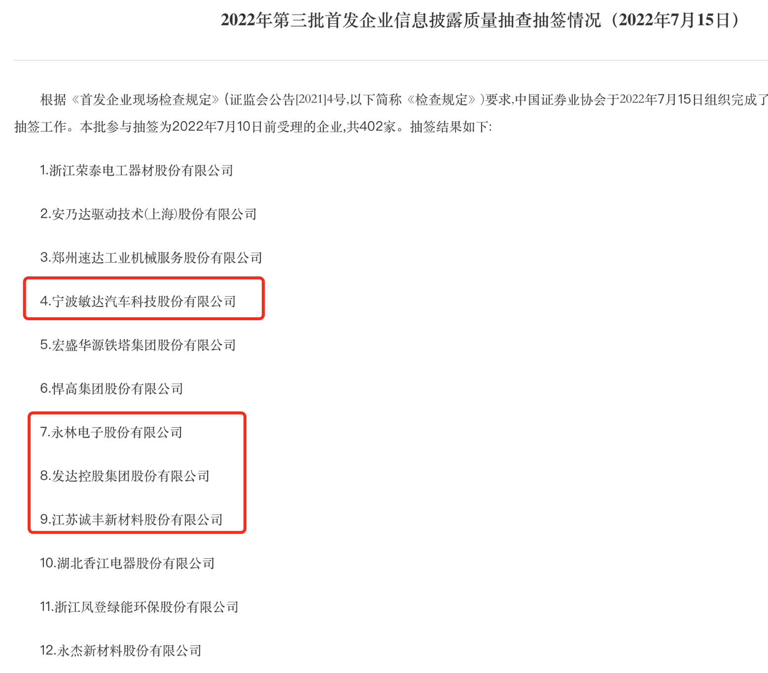 2022年第三批公司里,宁波敏达汽车科技股份有限公司、北京清大科越股份有限公司、四川英创力电子科技股份有限公司、上海索迪龙自动化股份有限公司,已通过撤回的方式终止了自己的IPO之旅;永林电子股份有限公司、发达控股集团股份有限公司、浙江峻和科技股份有限公司、江苏诚丰新材料股份有限公司、广东新大禹环境科技股份有限公司则进入终止审核企业名单。