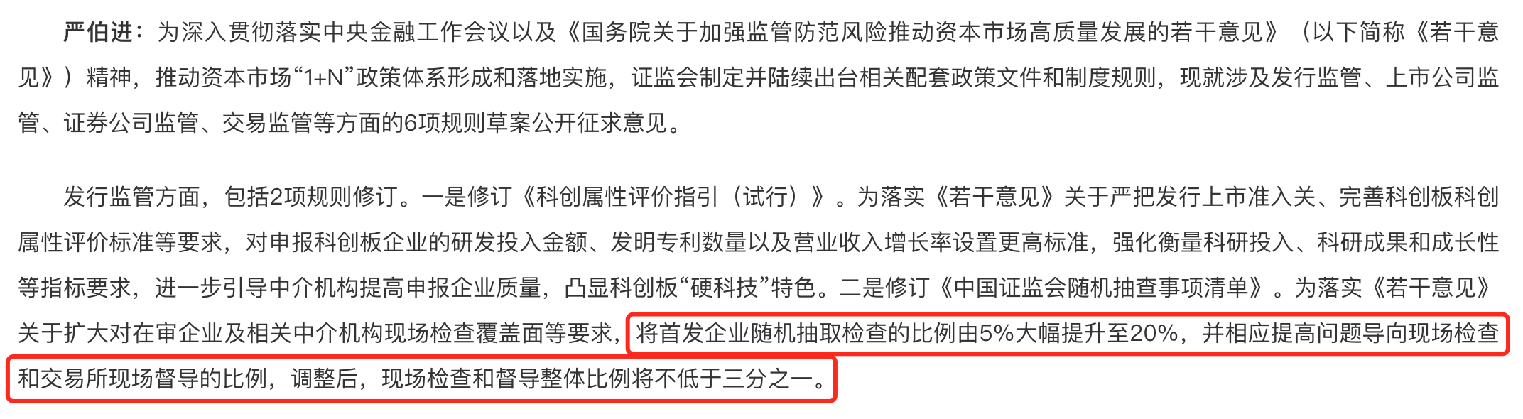 当日,证监会举行新闻发布会,首席风险官、发行司司长严伯进表示,“为落实《若干意见》关于扩大对在审企业及相关中介机构现场检查覆盖面等要求,将首发企业随机抽取检查的比例由5%大幅提升至20%,并相应提高问题导向现场检查和交易所现场督导的比例,调整后,现场检查和督导整体比例将不低于三分之一。”