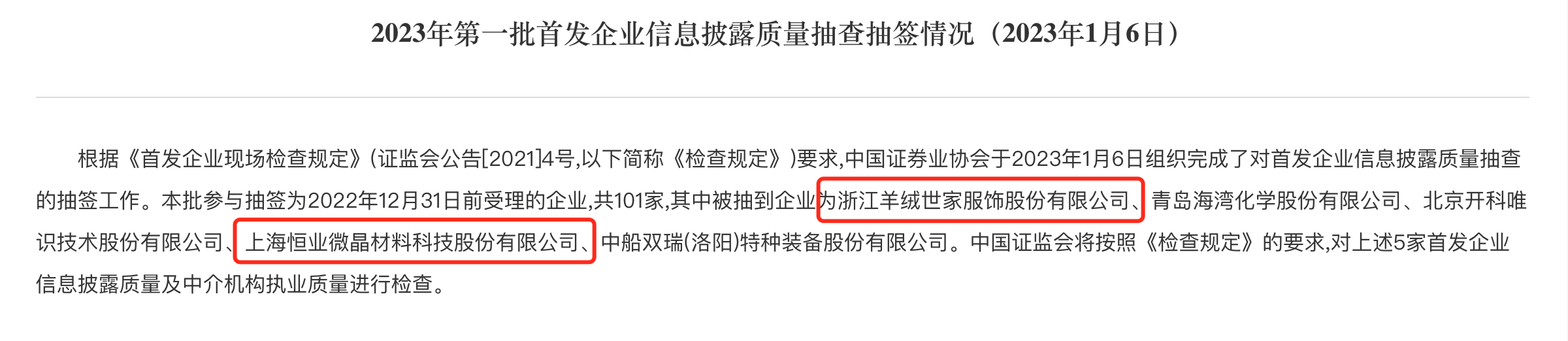 而在2023年第一批抽中的5家企业中,就有浙江羊绒世家服饰股份有限公司和上海恒业微晶材料科技股份有限公司已经“下线”。其中,浙江羊绒世家服饰股份有限公司是在该年1月份抽中后2月份就出现在终止审核企业名单里;上海恒业微晶材料科技股份有限公司在坚持到第二轮问询后也选择撤回终止。