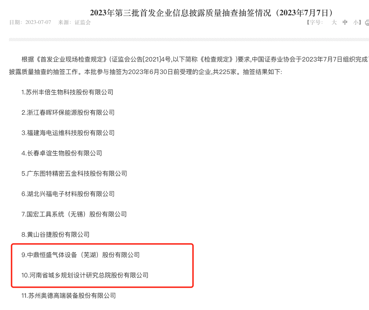2023年第三批抽中的11家企业中,又有中鼎恒盛气体设备(芜湖)股份有限公司和河南省城乡规划设计研究总院股份有限公司选择主动撤回终止了IPO。