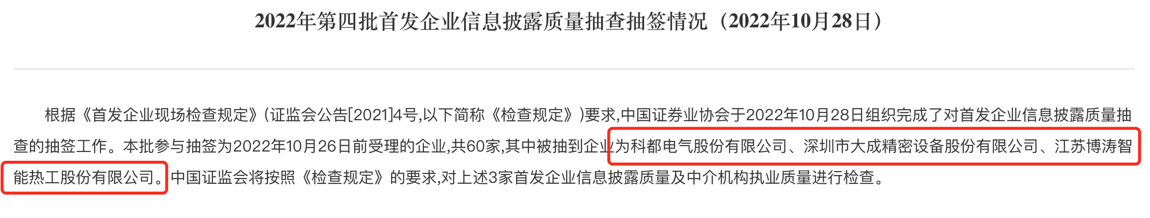 至于2022年第四批抽中的公司则是“全军覆没”,科都电气股份有限公司、深圳市大成精密设备股份有限公司已撤回,江苏博涛智能热工股份有限公司的状态也显示终止。