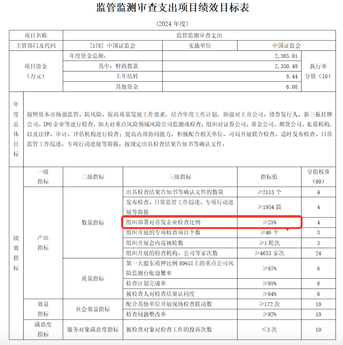 根据《2024年度中国证监会部门预算》,2024年度的总体目标中提及“加强对上市公司、债券发行人、新三板挂牌公司、IPO企业等进行检查,加大对重点风险领域风险公司监测或检查;组织对证券公司、基金公司、期货公司、私募机构,以及法律、审计、评估机构进行检查”。其中,“组织部署对首发企业检查比例”显示为不低于25%。