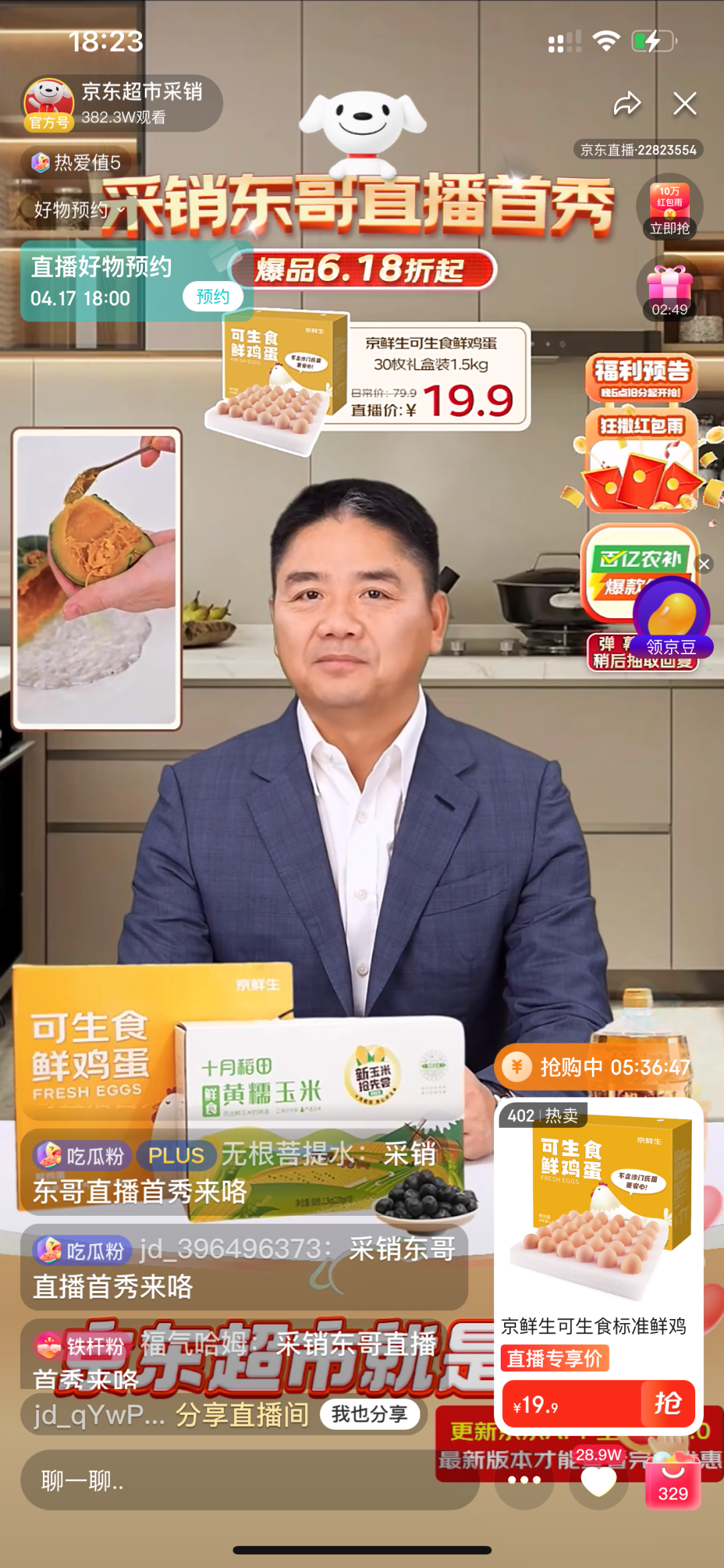 4月16日,壹览商业准时通过京东APP主页的逛界面进入京东采销直播间,刘强东数字人开播前,直播间在线人数已破200万,开播三分钟在线人数达321.7万,开播五分钟在线人数达382.3万。
