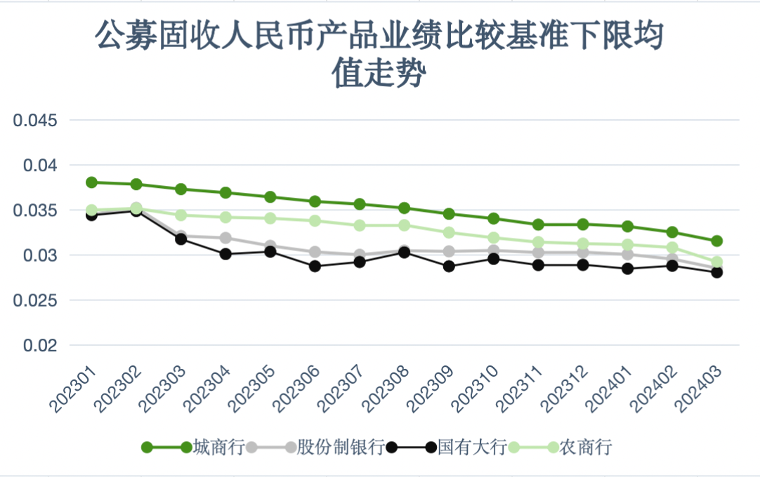 银行理财的业绩比较基准近一年一直呈现下降趋势,根据睿智新虹理财研究院的数据,从2023年年初开始,各类银行理财子的固收类产品的业绩比较基准就一直在下降。其中,城商行类和国有大行类理财机构下限均值下降的幅度较大。截止3月底,国有行理财子的业绩比较基准下限均值仅为2.80%,股份行理财子业绩比较基准下限均值为2.85%,城商行为3.15%。混合类产品的境遇也相似,国有行和城商行理财子的业绩比较基准下限也都降到了3%以下。