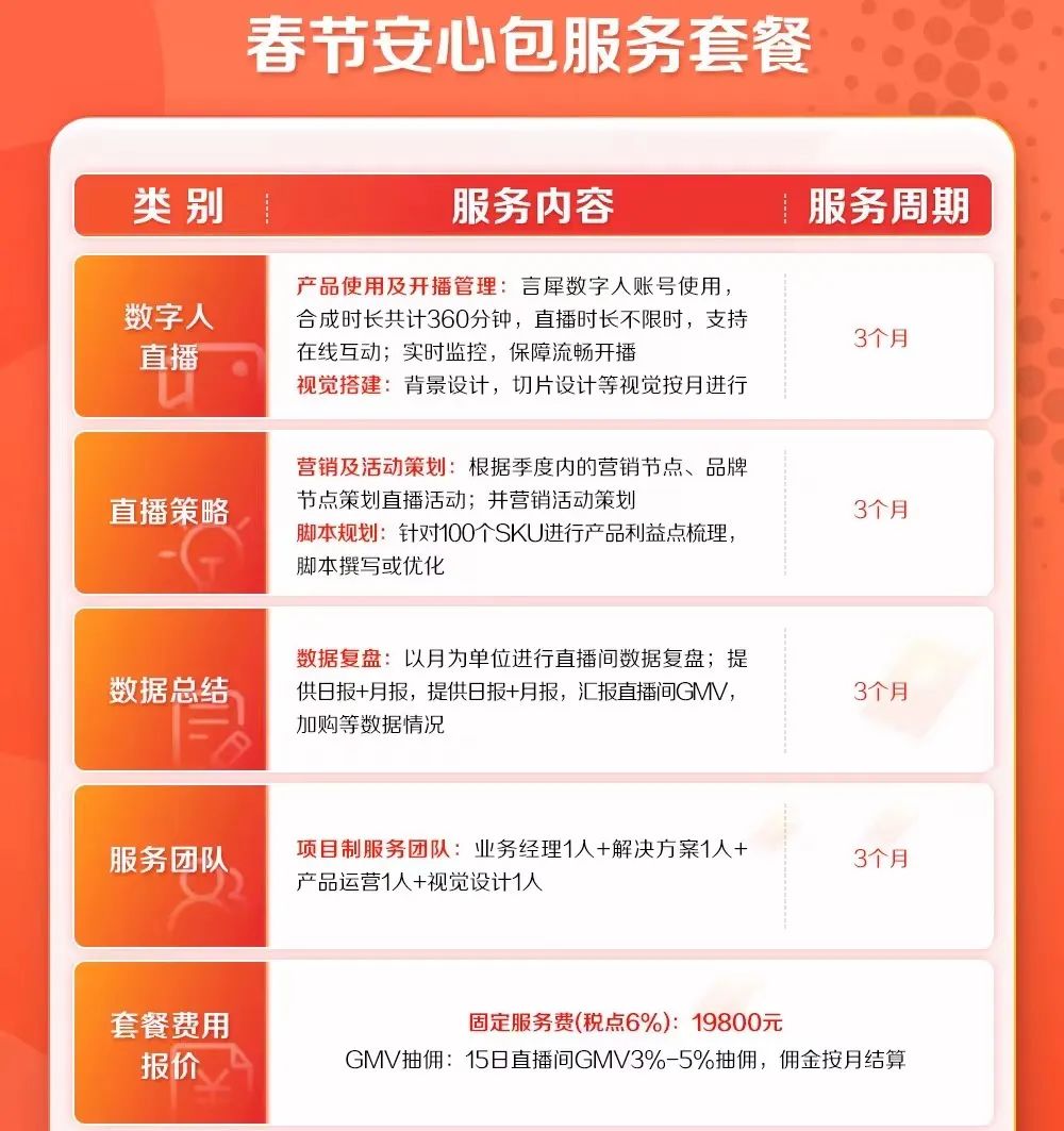 ▲ 言犀数字人在今年春节期间曾推出服务套餐,除了三个月的固定服务费19800元外,还需对GMV进行抽佣。图/京东云官方