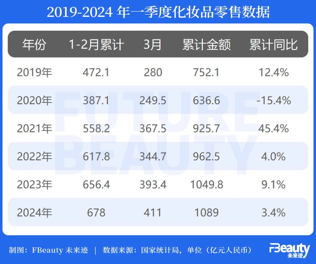 从国家统计局历年公布的数据来看,2024年一季度化妆品累计零售额继续创造历史新高,但增速则自2021年以来持续放缓。