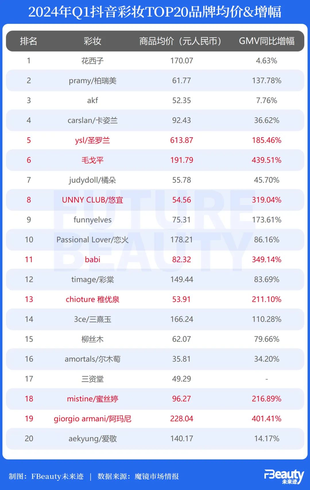 取得接近/超过200%增幅的品牌大致可以被分为两类:一类是YSL、毛戈平、阿玛尼等高端彩妆品牌,另一类则是以稚优泉、蜜丝婷、方里和babi为代表的产品价位低于100元的大众彩妆。