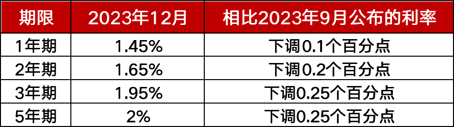 大行整存整取定存利率(2023年12月公布数据)