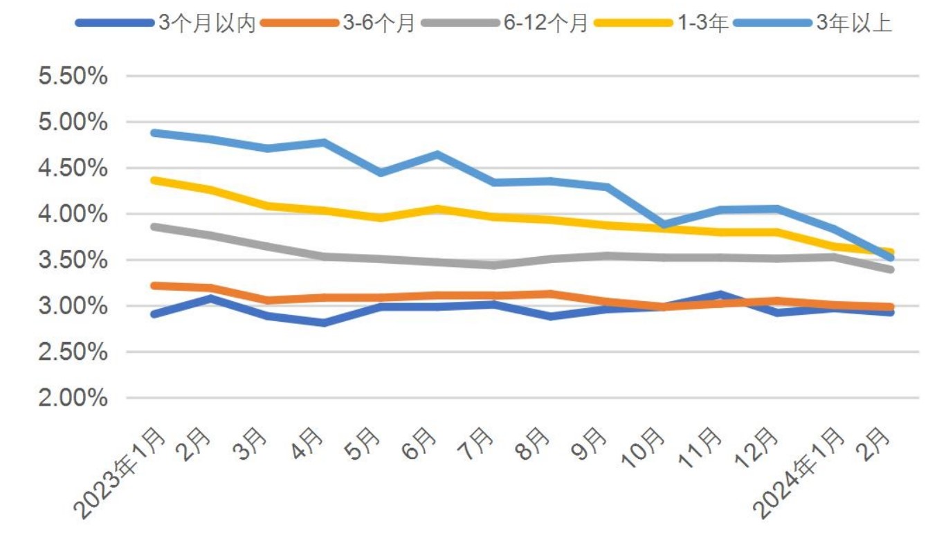截至2024年2月,固收类理财业绩基准从4.14%降至3.33%,3个月以内固收类理财新发业绩基准已低于3%,进入“2”字头。