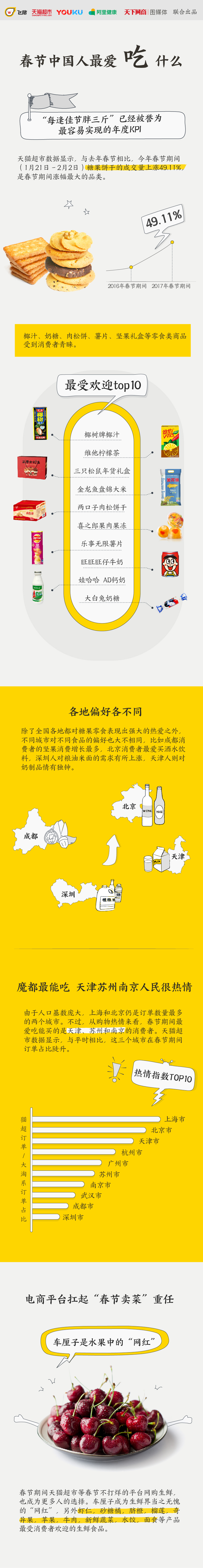 天猫超市数据显示,与去年春节相比,今年1月21日-2月2日糖果饼干的成交量上涨49.11%,是春节期间涨幅最大的品类。椰汁、奶糖、肉松饼、薯片、坚果礼盒等零食最受消费者青睐。生鲜领域,车厘子无疑是水果中的“网红”,速冻水饺的销售涨幅也十分明显。