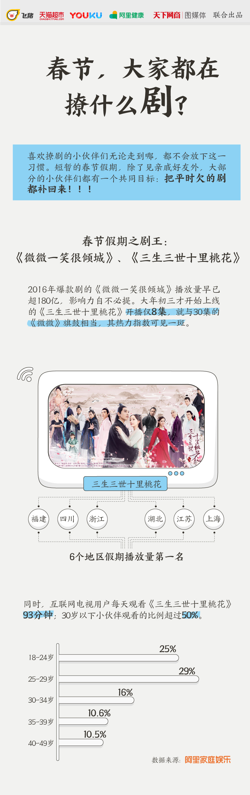 同时,阿里家庭娱乐数据显示, 互联网电视用户每天观看《三生三世十里桃花》93分钟;30岁以下年轻用户观看比例高达54%。