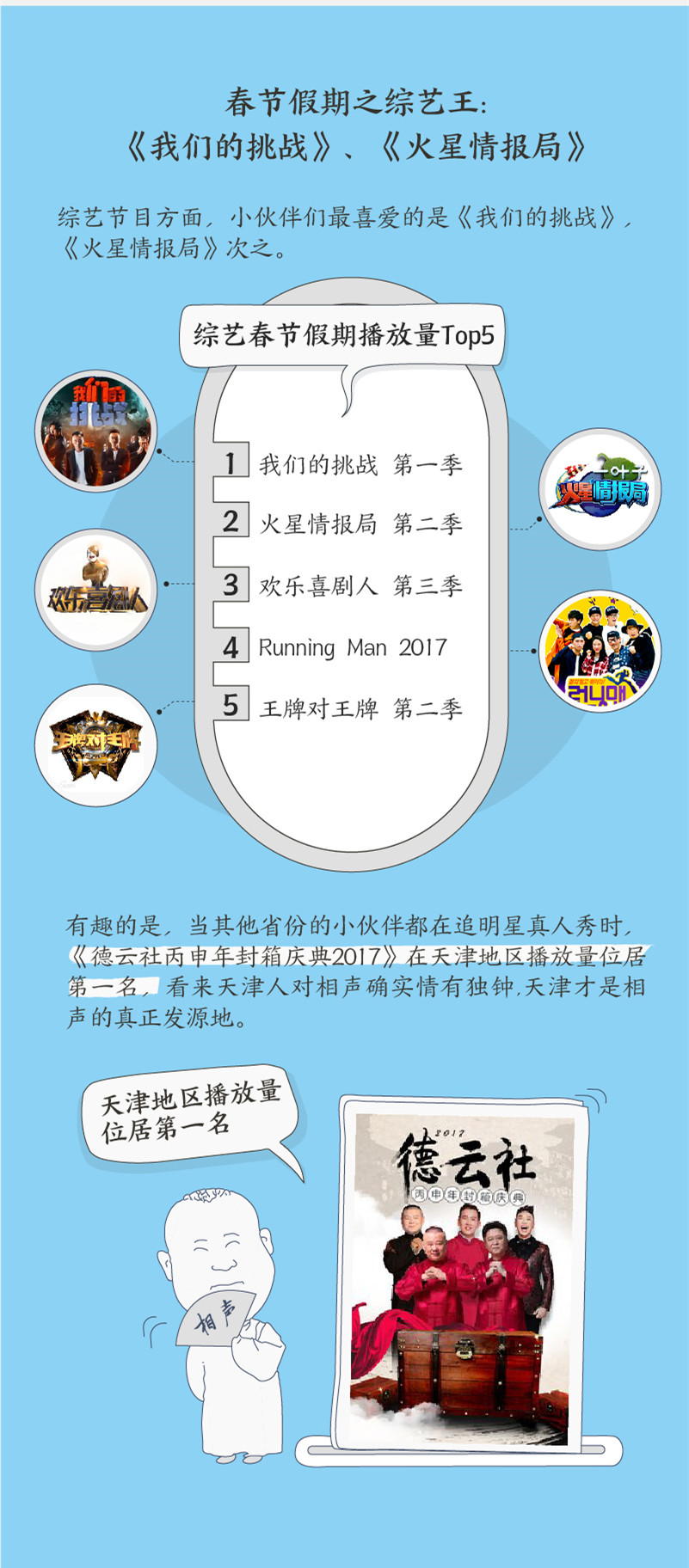 综艺节目方面,人们最喜爱的是《我们的挑战》,《火星情报局》次之。有趣的是,当其他省份都在追明星真人秀时,《德云社丙申年封箱庆典2017》在天津地区播放量居首,看来天津人对相声确实情有独钟。