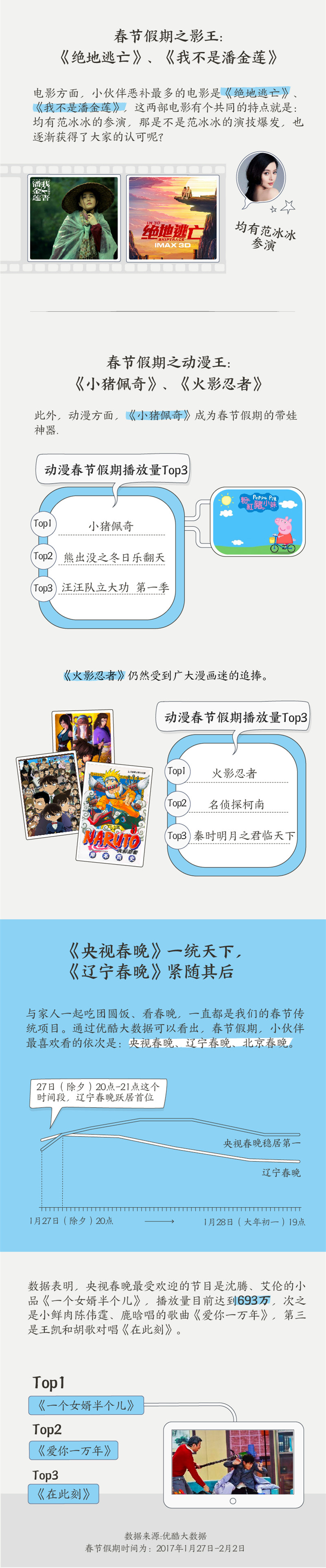 电影档中,看得最多的电影是同有范冰冰参演的《绝地逃亡》、《我不是潘金莲》。动画片《小猪佩奇》成为春节假期的带娃神器,《火影忍者》仍然受到广大漫画迷的追捧。