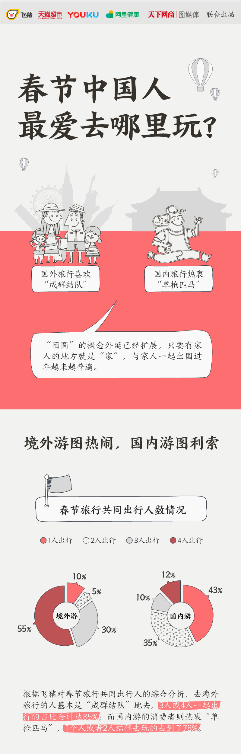 根据飞猪对春节旅行的数据分析,去海外旅行的人多是“成群结队”,3-4人一起出行的占比达85%;而国内游的消费者则热衷“单枪匹马”,1-2人结伴去玩的占到了78%。