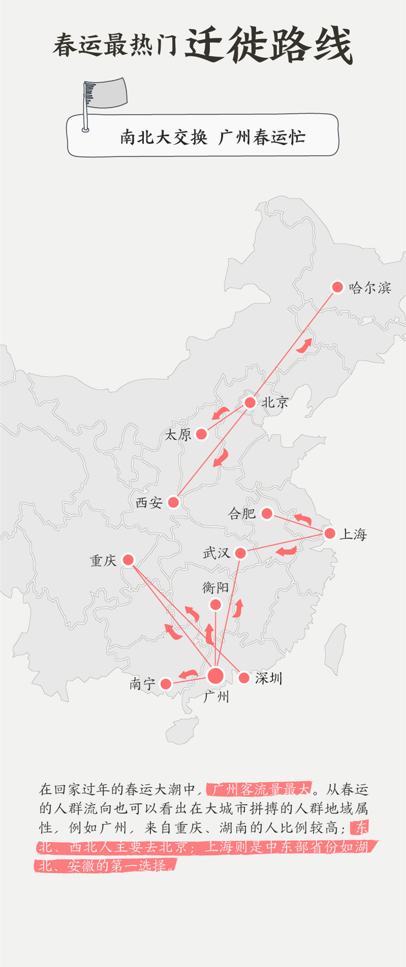 在回家过年的春运大潮中,广州客流量最大。从春运的人群流向也可以看出在大城市拼搏的人群地域属性,例如广州,来自重庆、湖南的人比例较高;东北、西北人主要去北京;上海则是中东部省份如湖北、安徽的第一选择。
