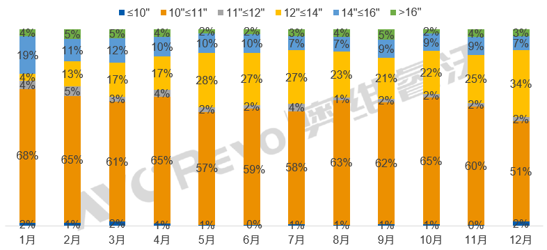学习平板市场的尺寸段主要集中在10"≤11",该尺寸段销量占比相对稳定,同时12"≤14"月度市场份额正逐渐增长,这反映出家长越来越重视屏幕的质量,更倾向于选择配备先进的视力保护技术和更大显示屏的学习平板,奥维睿沃(AVC Revo)认为这一趋势将延续,而这些因素也将成为吸引消费者的关键卖点。