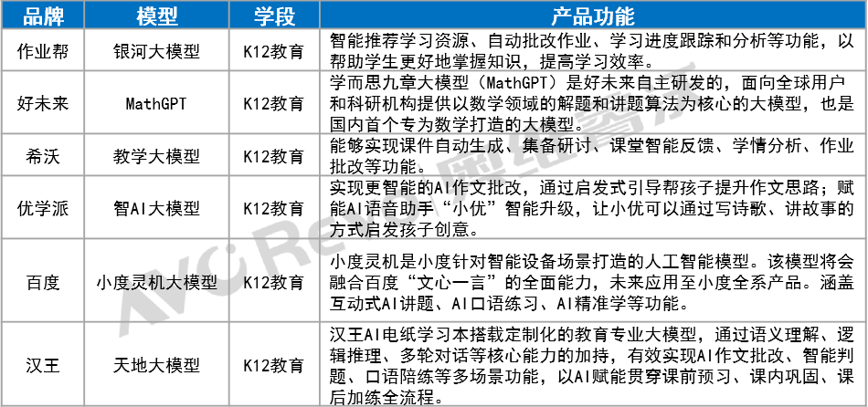 目前,市场上很多品牌针对K12教育开发了教育大模型,功能主要集中智能推荐学习资源、自动批改作业、学习进度跟踪和分析、解题和讲题算法、课件自动生成、智能AI作文批改几个方面,教育大模型与学习平板的深度结合,可以根据每个孩子的学习习惯、能力和进度提供定制化的学习内容和推荐,使得学习平板变成一个个性化的学习伙伴。因此,奥维睿沃(AVC Revo)认为,在教育信息化、人工智能深入融入教育的发展趋势下,学习平板将成为人工智能+大模型的最佳载体,而学习平板必然有着更广阔的市场空间和潜力。戳→奥维数据罗盘
