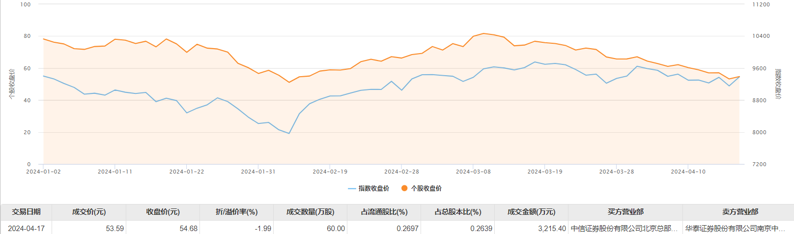钧达股份4月17日大宗交易成交60万股,成交额3215.4万元,占当日总成交额的7.95%,成交价53.59元,较市场收盘价54.68元折价1.99%。
