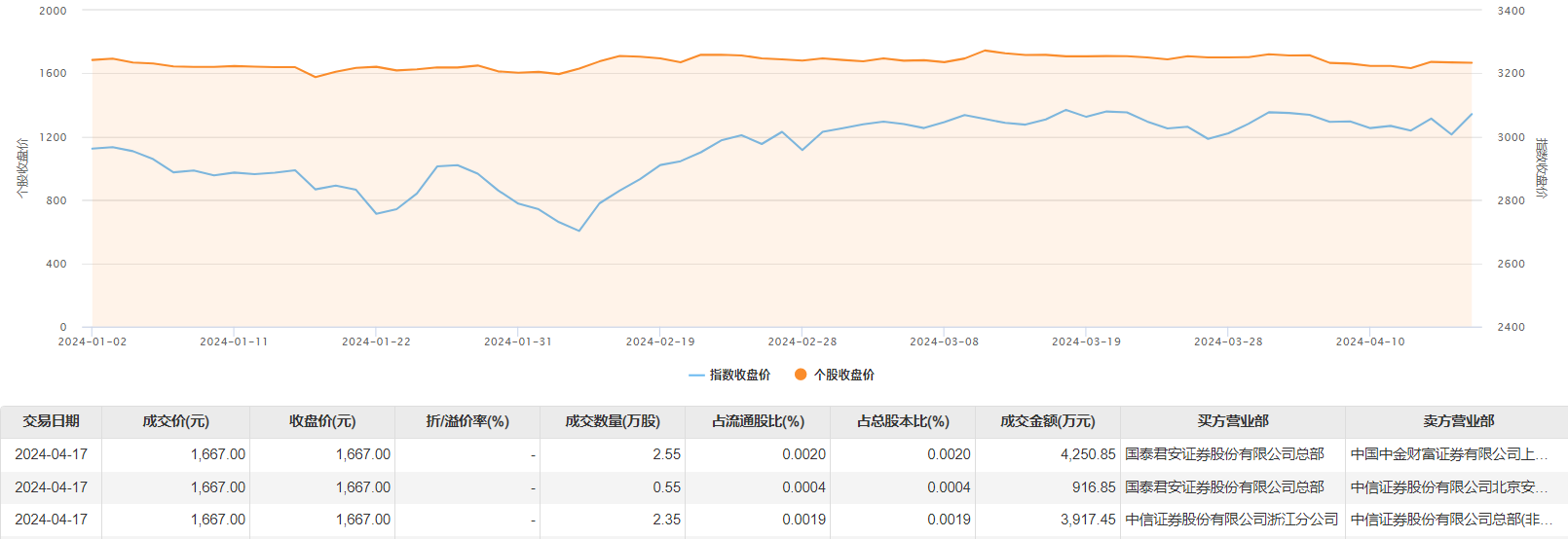 贵州茅台4月17日大宗交易成交5.45万股,成交额9085.15万元,占当日总成交额的2.15%,成交价1667元,较市场收盘价1667元持平。