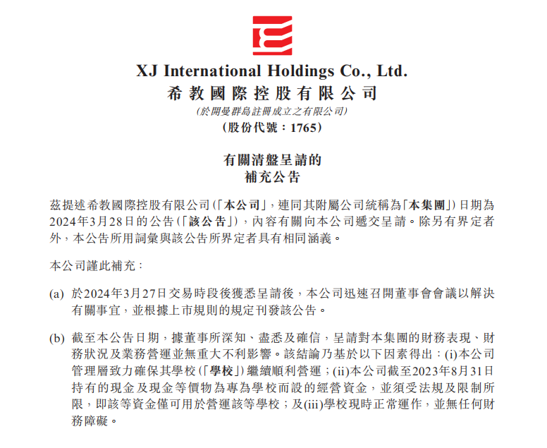 4月14日,原希望教育集团(1765.HK,简称“希望教育”),现更名为希教国际控股有限公司,发布有关清盘呈请的补充公告,回应了债务处置最新进展。