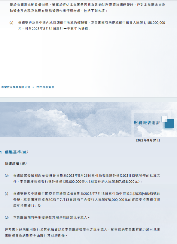 并且希望教育在净流动负债持续经营中也阐明,因1至5年内可提取银行融资额尚有11.88亿元,境外债及境内资产支持票据获批授信额度合计有18.67亿元,加上预期向学生收取的与教育服务相关的现金流,董事会认为有能力于未来履行财务责任。