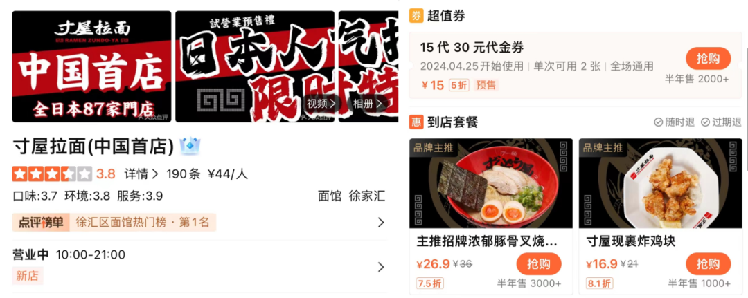 第一波消费者主要是尝鲜而来,生意还算不错,为了维持开业初期的人气,寸屋拉面通过点评平台预售15元代30元的代金券,从4月25日开始使用,每次消费最多可用两张。