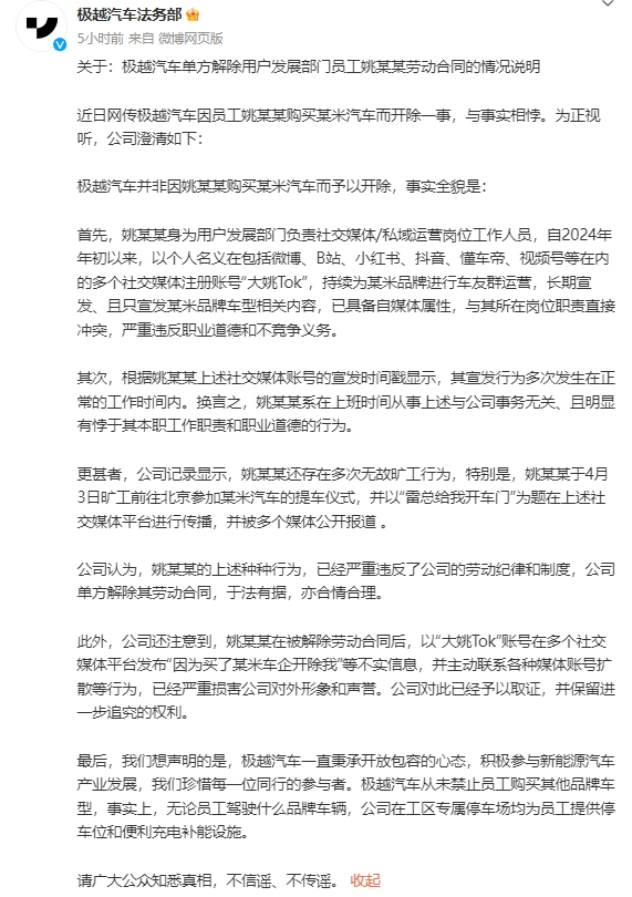 4月17日,极越汽车发布官方声明称,姚某作为极越用户发展部门负责社交媒体/私域运营岗位工作人员,自2024年年初以来,以个人名义在多个社交媒体注册账号“大姚Tok”,持续为某米品牌进行车友群运营,长期宣发、且只宣发某米品牌车型相关内容,已具备自媒体属性,与其所在岗位职责直接冲突,严重违反职业道德和不竞争义务。