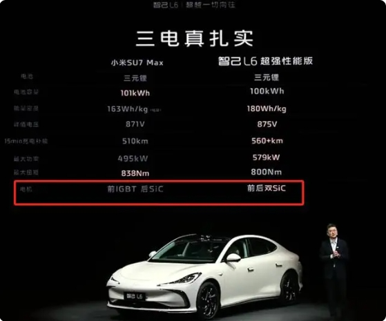 4月8日,智己汽车召开新车发布会,数据录入错误,称小米SU7 Max版本采用了前IGBT后碳化硅模块的电驱,智己L6则采用了前后双碳化硅电驱。事实上,小米SU7 Max和智己L6均采用了碳化硅电驱。