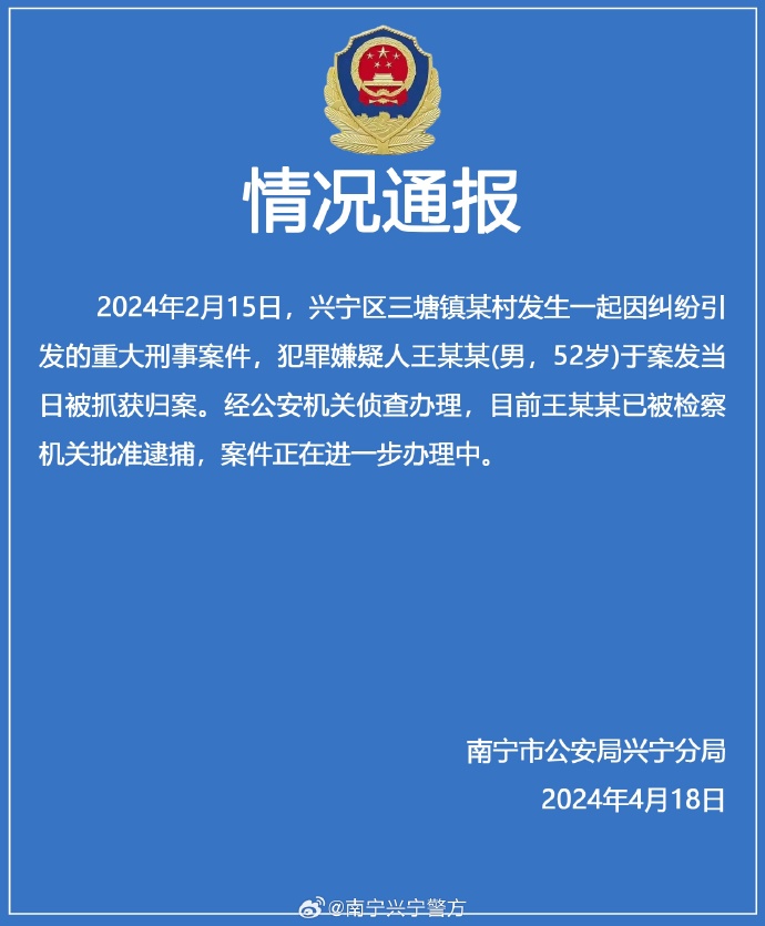 @南宁兴宁警方 发布情况通报,2024年2月15日,兴宁区三塘镇某村发生一起因纠纷引发的重大刑事案件,犯罪嫌疑人王某某(男,52岁)于案发当日被抓获归案。经公安机关侦查办理,目前王某某已被检察机关批准逮捕,案件正在进一步办理中。