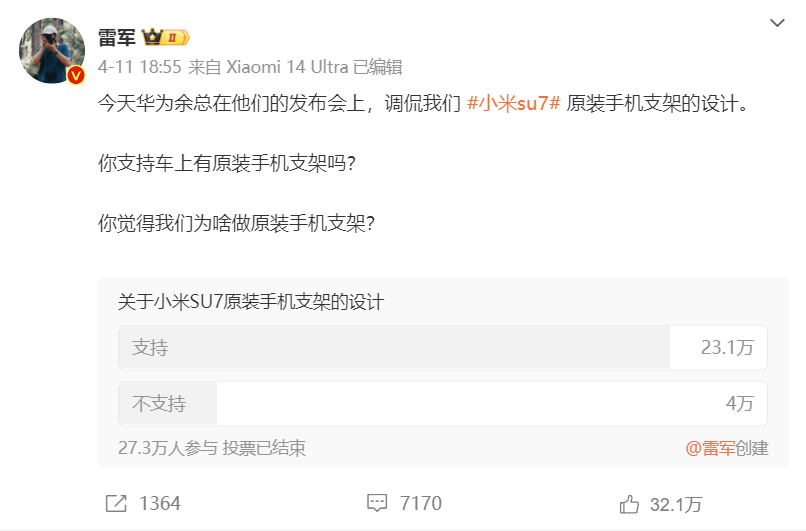 对于余承东言论,雷军在微博发文称:“华为余总在他们的发布会上,调侃我们小米SU7原装手机支架的设计。”同时,雷军还提问并发起投票:你支持车上有原装手机支架吗?你觉得我们为啥做原装手机支架?