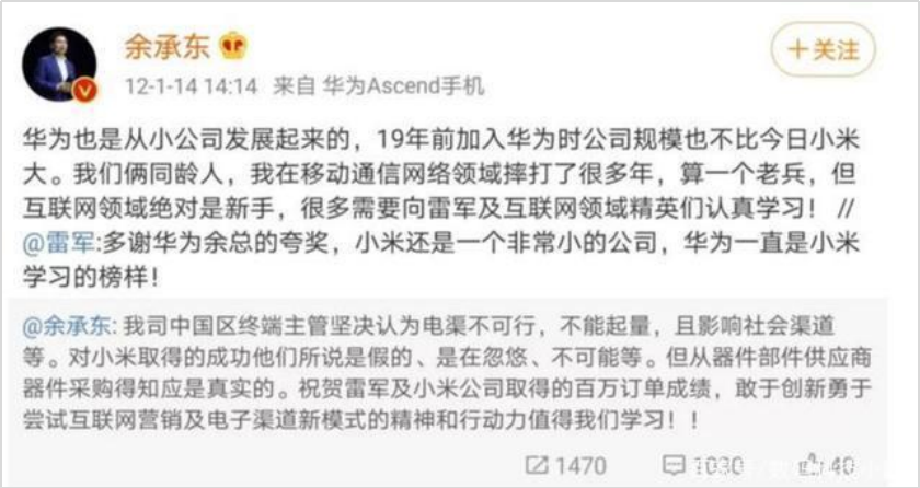 仅仅几年后,华为小米开始了真正的竞争,两家企业高管在各自的产品发布会上频繁互怼。