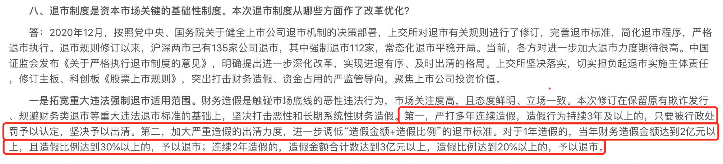而在此之前严格重大违法退市适用范围只有一档,即“连续2年造假金额5亿元以上且超过50%”。