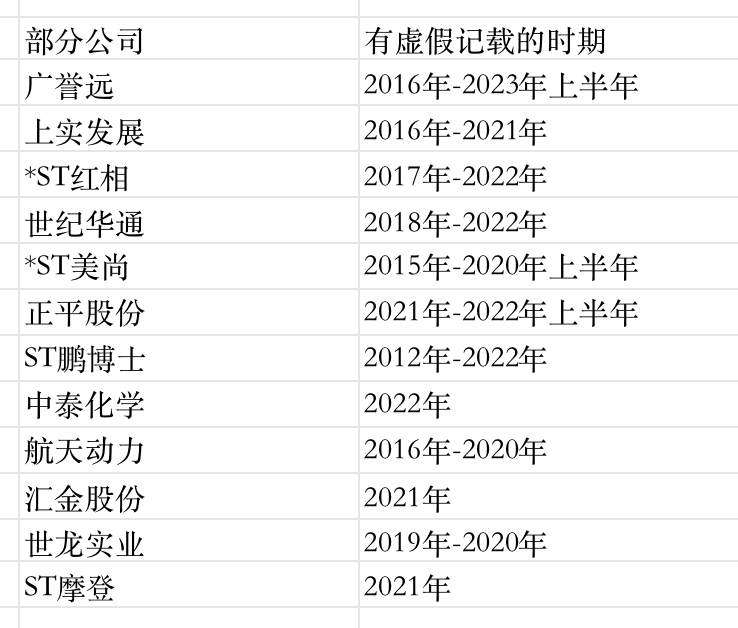 界面新闻注意到,今年来有不少上市公司领到行政处罚或相关事先告知书,其中涉及有虚假记载的公司就不少。典型如广誉远(600771.SH),在2016年至2022年年度报告及2023年半年报中存在虚假记载,已涉及营业收入、利润总额等主要财务指标。据悉,该公司是在2024年3月25日收到的《行政处罚及市场禁入事先告知书》,距离4月12日新“国九条”的颁布,相差也就半月。