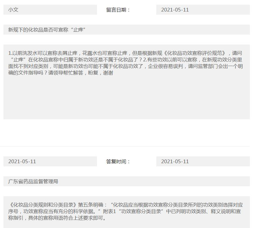值得一提的是,早在2021年5月11日,就曾有人在广东省药品监督管理局互动交流平台提问,“新规下的化妆品是否可以宣称止痒”。