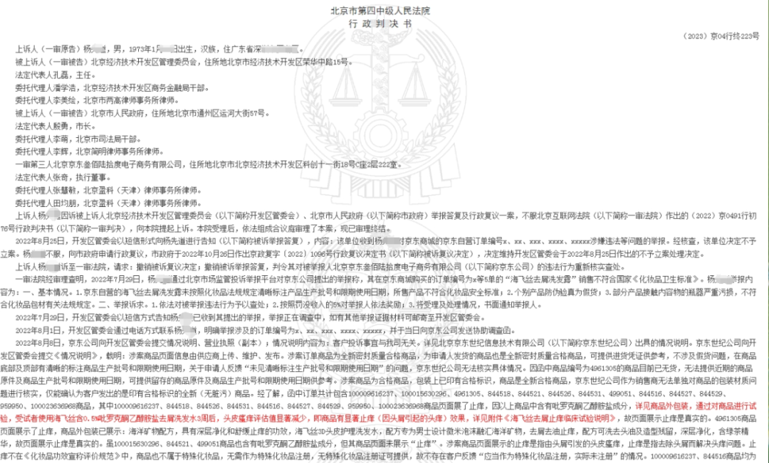 判决书显示,杨某某此前通过北京市市场监管投诉举报平台反映,京东网站销售的部分海飞丝洗发水产品声称具有“止痒”效果,属于化妆品新功效,应视为特殊化妆品并进行相应注册,但实际上其未进行注册操作。对此,北京经济技术开发区管理委员会经调查后,决定不予立案。而后,不满该处理结果的杨某某遂向第四中级人民法院提起行政诉讼。